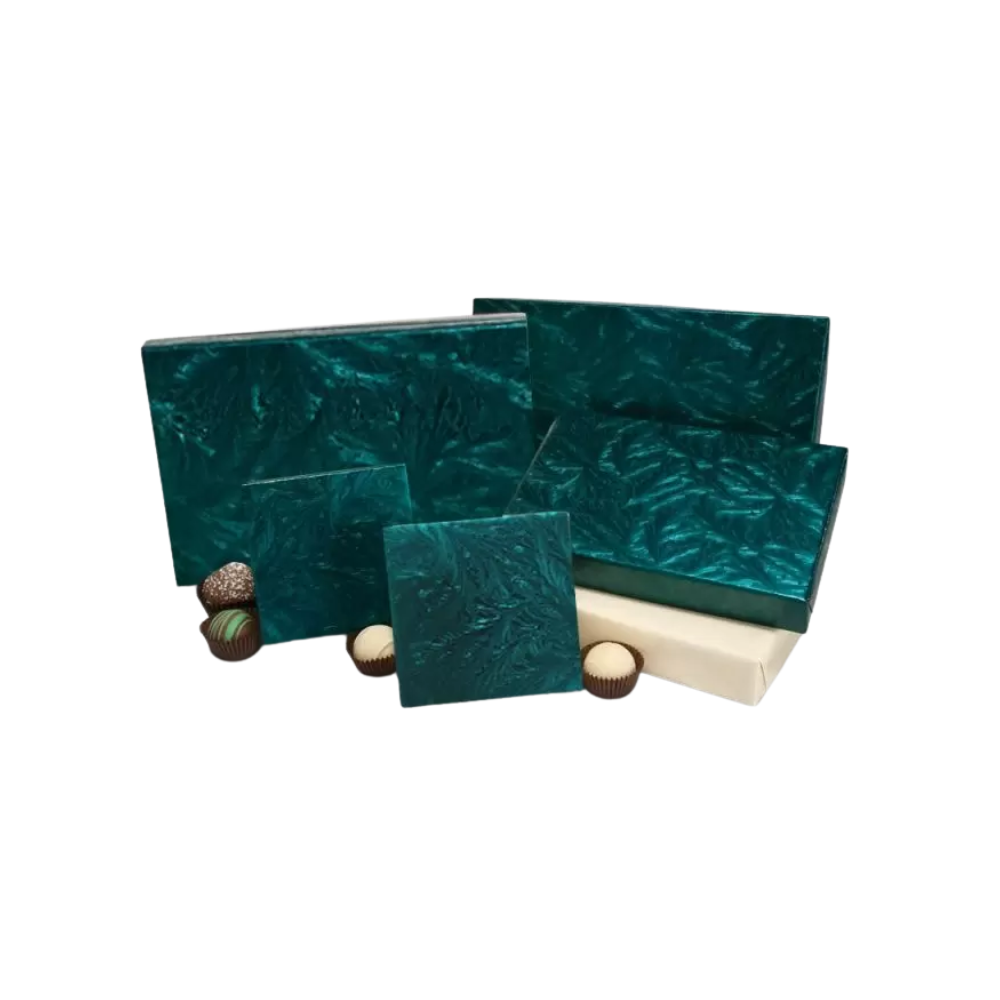 Make your candies look elegant with Embossed Forest Green Rigid Candy Boxes from Saga Printing. These boxes add a touch of class to your chocolates, candies, and sweets. The rich forest green color with embossed patterns gives a stylish and premium look that boosts your brand image.