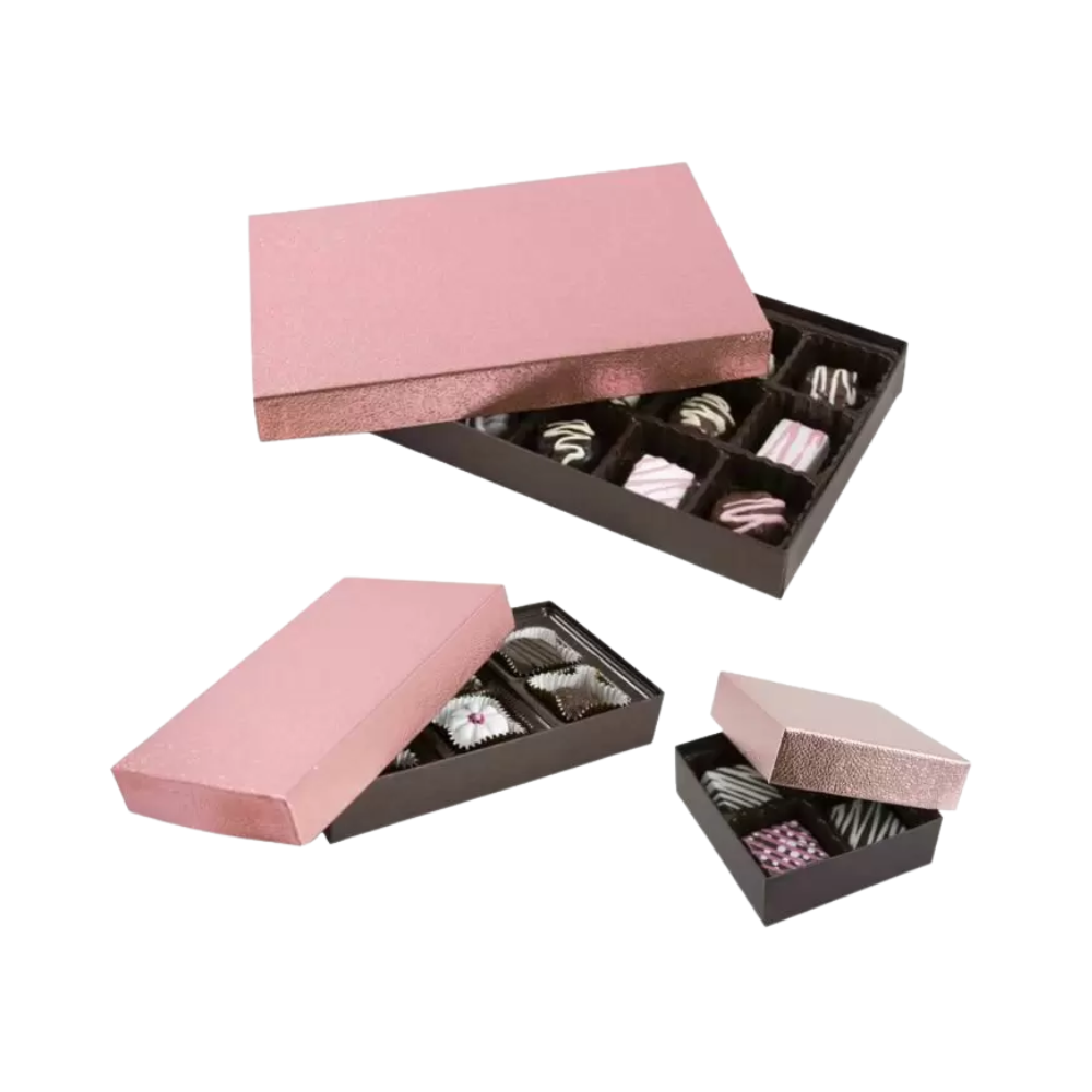 | Box Style | Metallic Rose Embossed Dark Chocolate Base Rigid Candy Boxes |