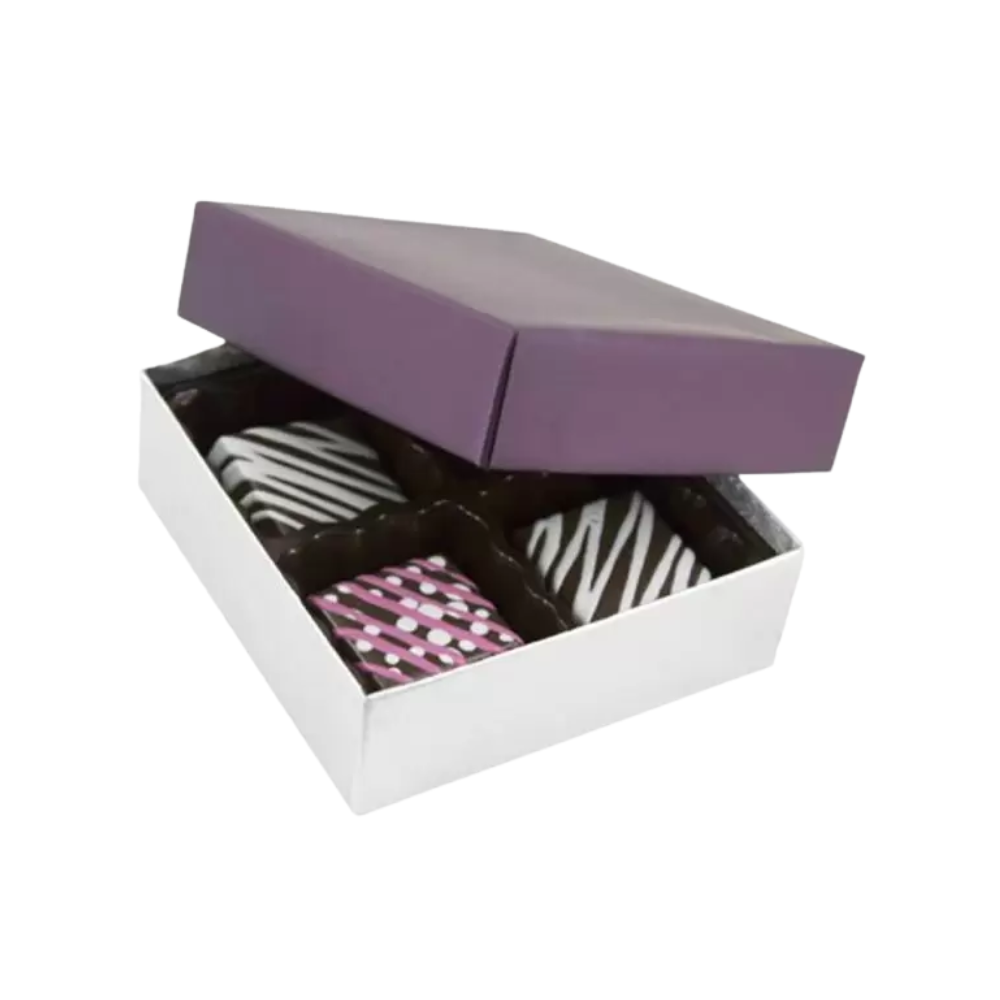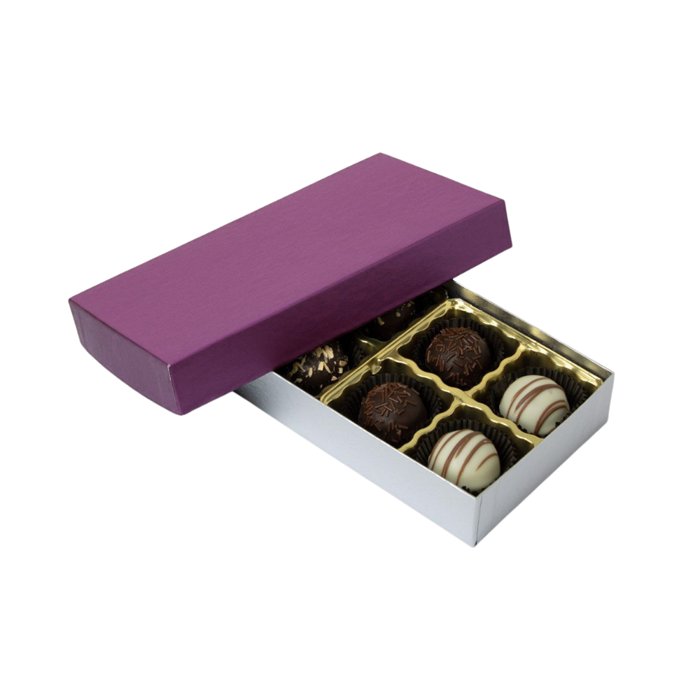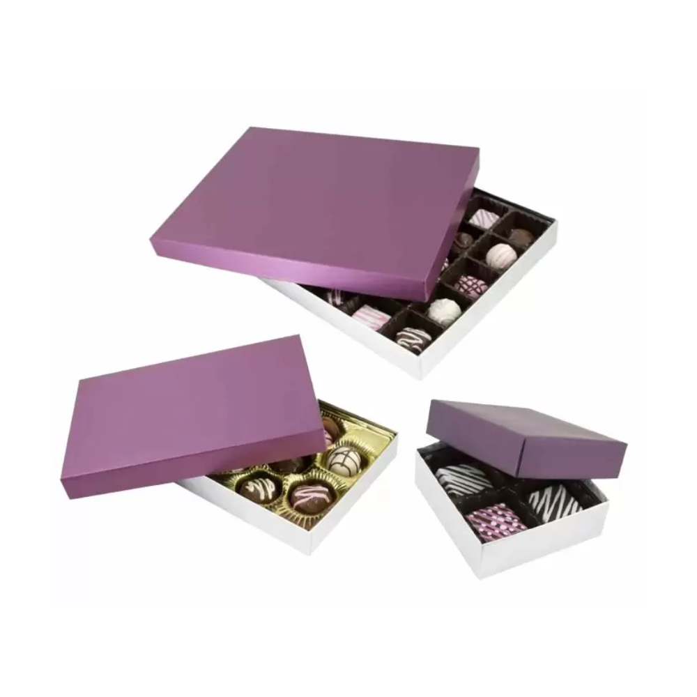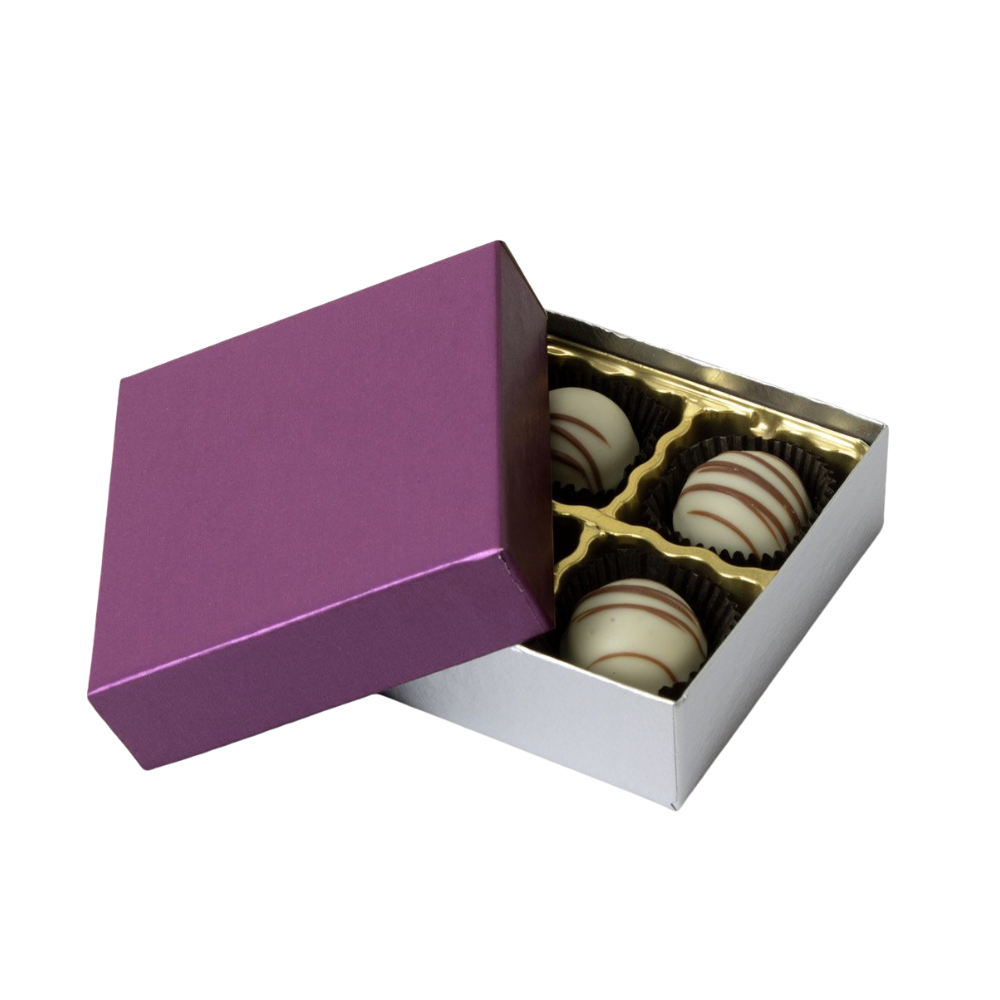 Give your sweets a classy look with our Plum / Silver Silk Base Rigid Candy Boxes. These boxes are perfect for candies, truffles, and chocolates. The plum top with a silver silk base makes them look elegant and stylish. They are great for gifts, parties, and retail displays. Made with strong materials, they are durable and show off your brand’s quality.